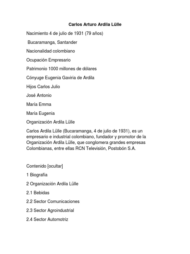 Carlos ardila lülle (bucaramanga, 4 de julio de 1930), es un empresario e industrial colombiano descendiente de inmigrantes alemanes, fundador y dueño de la organización ardila lülle, un conglomerado de grandes empresas colombianas como rcn televisión, y rcn radio, la marca de bebidas gaseosas postobón con sus embotelladoras, central cervecera de colombia e hincha del equipo. La muerte del empresario carlos ardila lülle, ocurrida en la madrugada de este viernes 13 de agosto en la ciudad de cali, causó gran consternación en el mundo empresarial y político colombiano. De colombia, egresando en 1951. The more than 80 companies that make up the ardila lülle organization (oal) employ more than 40,000 people throughout the country, and, according to forbes magazine, his fortune is estimated at us$2.3 billion, making him one of the richest men in colombia. Carlos ardila lülle (bucaramanga, 4 de julio de 1931), es un empresario e industrial colombiano, fundador y promotor de la organización ardila lülle, que con.